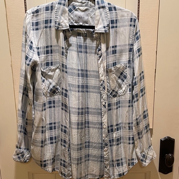 Stylish plaid button-down by Rails. Features navy and cream tones. Perfect for casual outings.