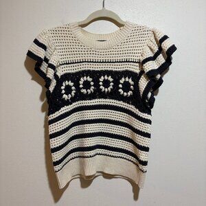 Rails Penelope Oat Navy Crochet Stripe Ruffle Short Sleeve Sweater Granny Square