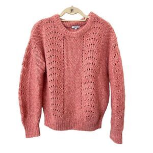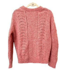 Cozy pink crew neck sweater. Features intricate knit design. Perfect for casual wear.