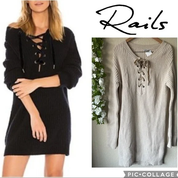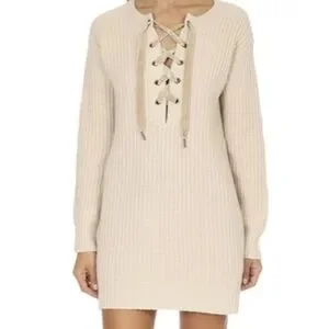 A broad velvet lace finished with metal aiglets criss crosses the neckline through metal grommets, punctuating the chunky knit of this sweater dress.