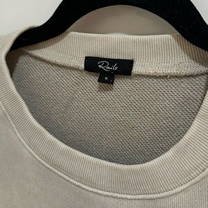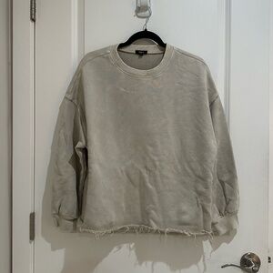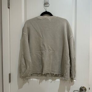 Super soft, lounge terry, long sleeve, faded green/grey crew neck sweatshirt featuring a soft, vintage wash, oversized fit, dropped shoulder, full sleeves, shirring at cuff, and raw hem. This fashion forward pullover style is perfect for relaxing at home or going about your day in the most comfortable fashion.