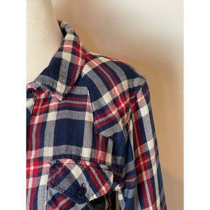 This blouse by Rails is in great condition. There is a tiny pick in the fabric on the back bottom as pictured. It is plaid with colors of red, blue, and white throughout. It has a collared neckline and two flapped patch pockets on the upper chest. It has long sleeves and button cuffs on each side. It has a button-down closure in the front. It is lined with a blue color fabric.
