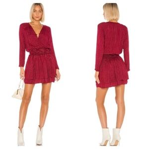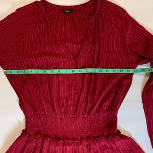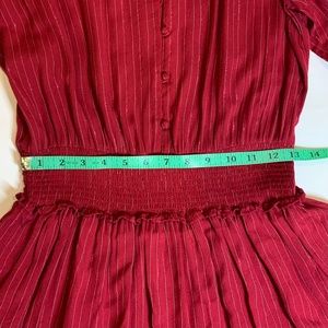 Perfect for holiday parties, cozy dinners, or anywhere you want to look dressed-up without trying too hard. This Rails red metallic dress brings that effortless glow — shimmering pinstripes woven into a soft, slinky fabric that moves beautifully when you walk. The smocked waist defines your shape without feeling tight, while the blouson bodice and subtle ruffle trim keep things relaxed but polished.