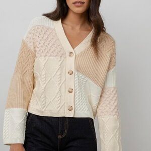Medium weight, cotton blend, long sleeve, soft ivory cardigan sweater featuring blush pink, sand brown, and white mixed cable knit patchwork design, relaxed fit, dropped shoulder, ribbed trim, and buttondown front with horn buttons. This super plush, stylish cardigan sweater is a great way to make a statement while keeping comfortable all season long.
