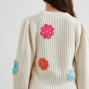 Soft cream knit crewneck. Crocheted floral appliqués in bright hues. Chunky textured stitch and relaxed fit. Playful, colorful accents on a neutral base.