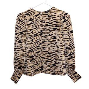 Lightweight, hammered satin, long sleeve, golden brown crew neck blouse featuring black tiger inspired print throughout, soft shirring at top of sleeve, and key hole at back neck. Show your feminine side in this easy, polished pullover top.