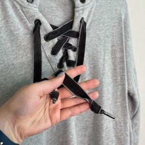 Stylish gray lace-up sweater. Perfect for casual outings.