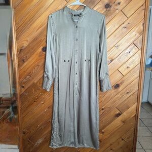 Chic sage green dress with long sleeves. Button-down front and waist tie. Perfect for versatile styling.