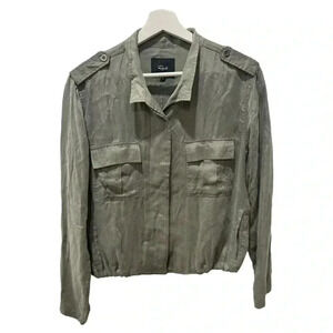 Add a touch of military-inspired style to your wardrobe with the Rails Sage Rowen jacket. This linen blend jacket features star embroidery accents, adding a touch of unique charm to your look. The jacket is a size L, and the color is a beautiful sage green, perfect for pairing with any outfit. The jacket's brand is Rails, and it has a regular fit, making it comfortable to wear all day long. This jacket is perfect for women who love to express their individuality through their fashion choices.