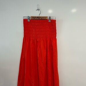 The Selena Skirt is meant for vacation and more, with style that's both beach-ready and city-appropriate. Done in vibrant red-orange, the skirt is designed with smocking that hugs that waist and a full, flowing skirt that hits mid-calf. Part of our Eco Collection, it's made of crisp, sustainable cotton poplin.