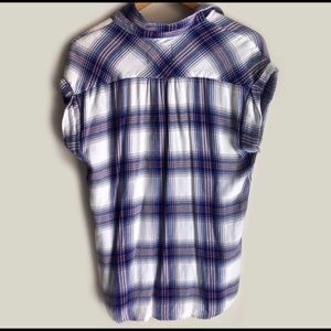 Blue, white, and red Rails sleeveless top with plaid throughout, dual patch pockets at front and button closure at front.