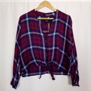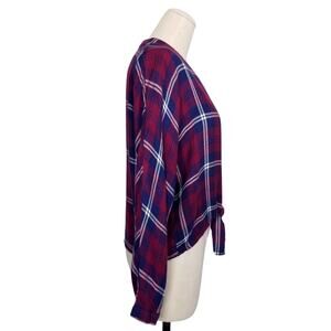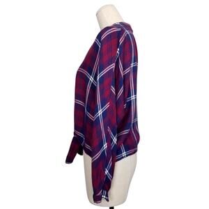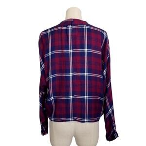 Rails "Sloane" tie waist shirt in red and blue plaid. Size medium. This super soft shirt features a tie waist, button-front closure, collarless design, and long sleeves.