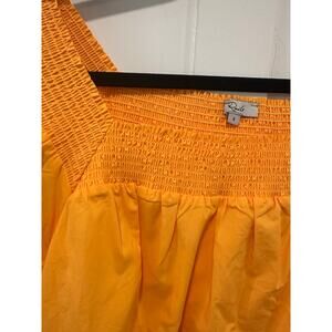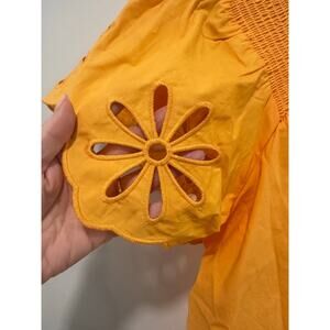 Love the floral eyelet like detail. Golden orange color. Smocking around neckline.