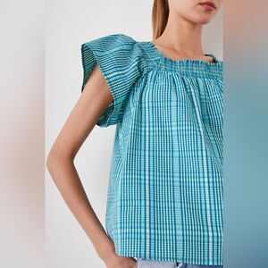 The Sonora Top is a warm-weather must have with pretty flutter sleeves, a relaxed boxy fit, and sweet plaid pattern of blues and greens. It's made from sustainable cotton poplin and is finished with a puckered, textural feel.