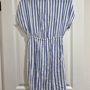 Rails striped dress. Blue and white stripes with tie closure at bust. Stretchy waist and pockets. Very flattering. Mild discoloration on the inside of the back neckline. Originally $230.