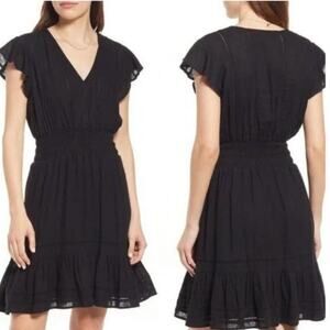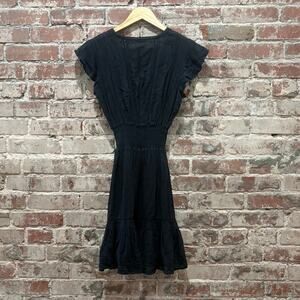 This effortless pullover style mini dress comes with a smocked waistline for added comfort. Made from lightweight luxe linen, this black mini dress features romantic lace detailing, flutter cap sleeves, and a flowy ruffle detail at hem.