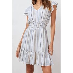 Rails Tara Montauk Stripe Dress Size Medium Linen Blend V Neck Ruffle Hem Casual