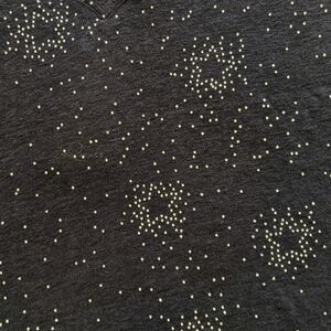 'Cara Stella' V-neckline. Short sleeves. Lightweight semi-sheer burnout fabric. All-over white star print throughout. Pullover style.