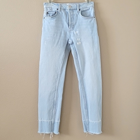 EUC Rails womens light wash The Melrose Classic Slim bleached denim jeans with 4 button fly and frayed hem
