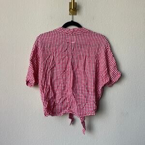 Rails 'Thea' button-front top in red mini gingham. Features a relaxed boxy fit, functional front buttons, and a tie-front hem. Lightweight, breathable blend of linen and rayon. Size Medium – 22” pit to pit; 19” length.