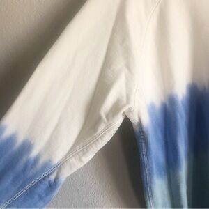 This super lounge worthy pullover style is perfect for relaxing at home or going about your day in the most comfortable fashion. Lightweight, lounge terry, long sleeve, ocean blue and ivory crewneck pullover sweatshirt features horizontal blue tie dye design, raglan sleeves, ribbed hem and cuffs, and a relaxed fit. Size L. Great preworn condition. Approx 21.5" armpit to armpit. 22.5" length.