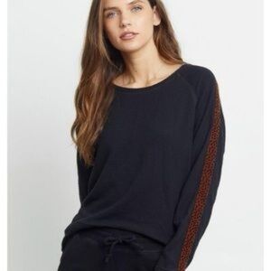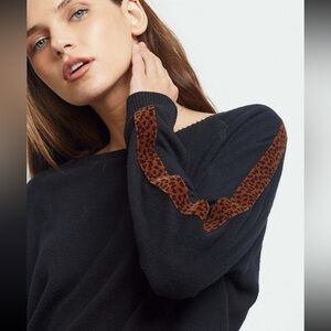 Stylish black sweater featuring leopard print stripes on the sleeves. Perfect for casual wear.