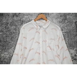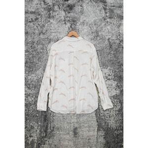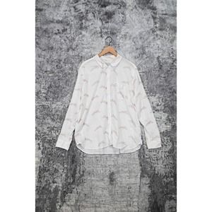 Stylish white button down shirt. Features subtle pink pattern. Perfect for casual or formal wear.
