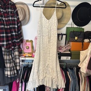 Chic maxi dress with black polka dots. Features a flowing silhouette and delicate straps. Perfect for casual elegance.