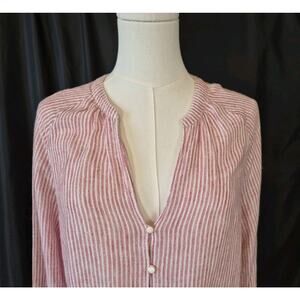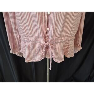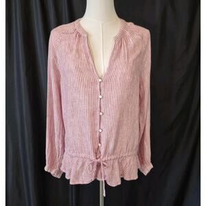 The Rails Women's Marti Scarlet Red Striped Peplum Blouse Top in size medium is a stylish and versatile piece for any woman's wardrobe. Made from a comfortable linen blend material, this blouse features a classic collared neckline, long sleeves, and a flattering peplum style. The red striped pattern adds a pop of color, while the ruffle accents give it a trendy touch. With a regular fit and lightweight design, this blouse is perfect for any casual or dressy occasion.