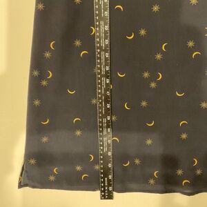 This luxe dark navy dress features an all-over pattern of tiny gold/yellow moons and stars.