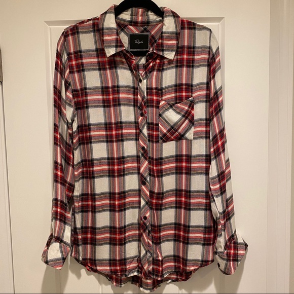 Rails classic button down. Red plaid with black, blue, and yellow. Front pocket with rounded hem and relaxed fit. Lightly worn in very good and clean condition. Size S.