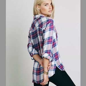 Super soft plaid button down with breast pockets. Button closures at sleeve cuffs. Slouchy, oversized silhouette. Great condition.