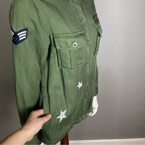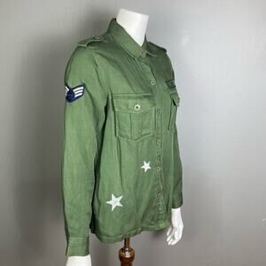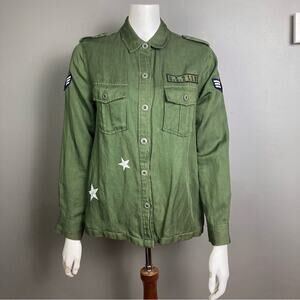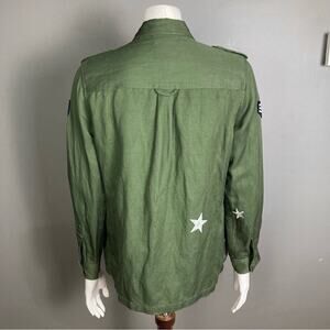 Embrace the rugged-chic look in this army shirt jacket accented with embroidery and star patch details.