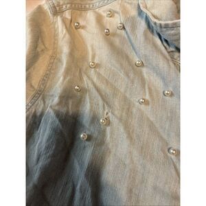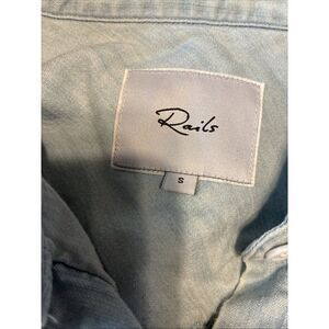 The product is a Rails Anthropologie light blue denim jean pearl long sleeve button-down top in size small. This stylish top features a button-up style with a long sleeve design, making it a versatile and fashionable addition to any woman's wardrobe. The light blue color and pearl detailing add an elegant touch to the classic denim jean fabric, making it a chic and trendy option for any outfit.