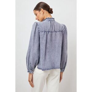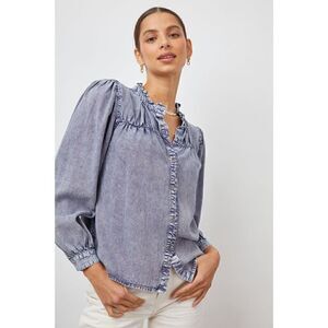 A feminine take on the classic long sleeve denim shirt. Made from lightweight Tencel denim this buttondown shirt features an acid wash finish, banded collar, puff sleeves, two slits at side seam hem, and romantic ruffle detail at neckline.