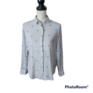 Long sleeved button up shirt with pinstripes and embroidered red lips and button cuffs. In excellent pre-owned condition. Size XS.