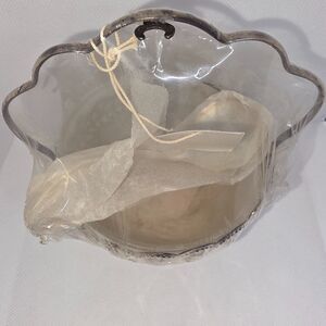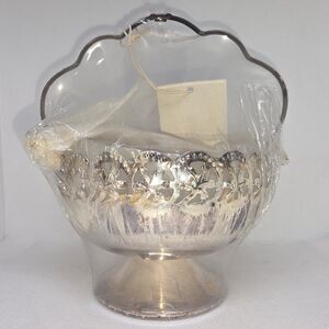 This elegant footed bowl features a fixed decorative handle, pierced floral rim, and a suspended spoon holder across the top. Inside is a removable clear liner (appears to be glass or hard plastic).