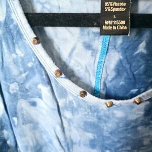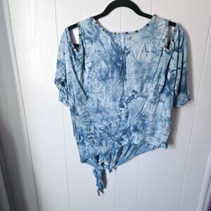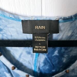 Rain brand tie dye cold shoulder top in size Large. Features a blue tie dye wash with stud accents along the neckline and straps, plus a front tie hem that adds a relaxed draped fit. Made from a soft and stretchy viscose blend (95% viscose, 5% spandex).