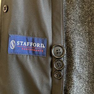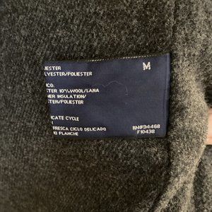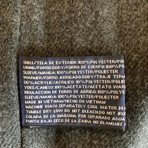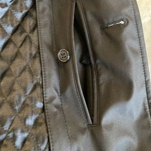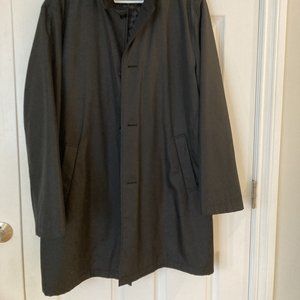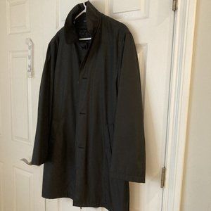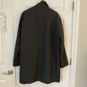 This raincoat is fully lined with removable (zip-out) quilted liner. The lining has a warmer wool-blend section and a polyester section for added warmth. Sleeves are lined as well. Has two deep slanted waist pockets on the outside and one large pocket with a button inside. The coat has a zipper and button closures in front for added protection and warmth. Size Medium- center back length (from where the collar starts to the end of the hem on the bottom) - 37 inches; sleeves - 25 inches. The shell of the coat is 100% polyester. Warmer lining is 10 % wool, 10% polyester, and 80% acrylic. Waterproof, windproof and very warm. The coat is in excellent condition. I wore it two times to office, but it is too big for me and I never wore it again. Clean, no smell, no tears.