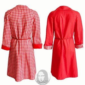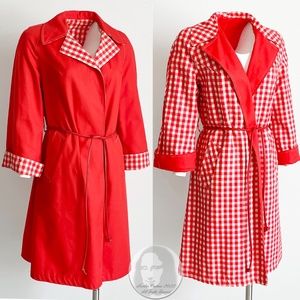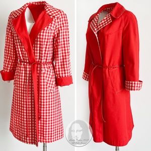Vintage REVERSIBLE belted rain coat, likely made in the 70s. Orange-hued red fabric on one side and matching red Gingham check on the other. So chic! Wrap-style with front pockets (both sides). Comes with red leather tie belt, as pictured. Machine or hand wash/no dryer. Preowned/vintage with minimal signs of prior wear, some loose threads toward bottom hem. Tagged size 8: shoulders - 15.25in, bust - 38in, waist - 28in, hips - 38in, shoulder to hem - 37in, sleeves (un-cuffed) - 22in.