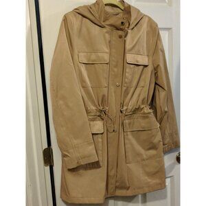 A luxurious rain jacket at a great price! Dress for summer showers in style with this beautiful DKNY jacket in your choice of Khaki or Navy. The material is absolutely beautiful. You'll find it highly functional with lots of pockets to keep you organized and dry. A cinched waist lets you flatter your figure or wear it loose and be comfortable. Hood is removable.