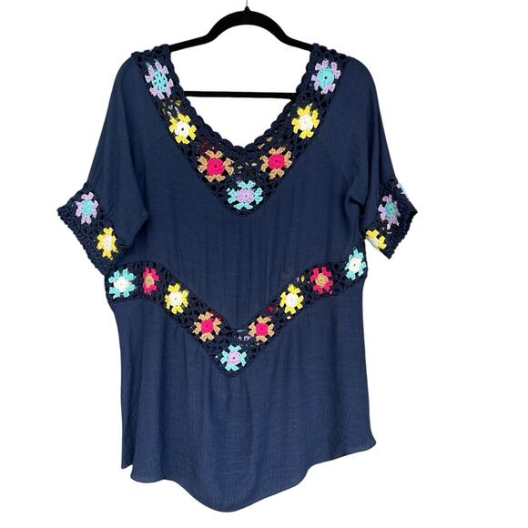 Rain Womens Granny Square Crochet Blouse Medium Blue Boho V Neck Hippie Festival