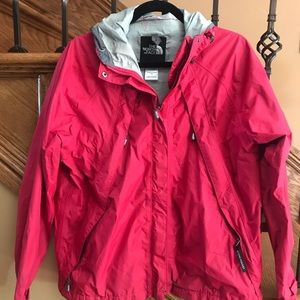 Red rain jacket with hoodie that tucks in.