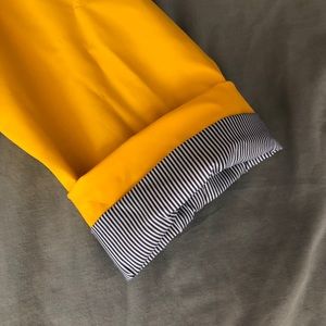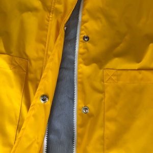 Fisherman style jacket with navy blue pinstripes on entire inside material. Six metal buttons plus white zipper for extra protection. Never worn. I’m 5’ 5” and it reaches to just above my mid thigh for reference. It’s a size 8.