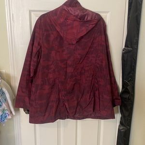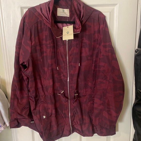 Thin lightweight wind breaker with 2 front pockets and a pull tie on waistband