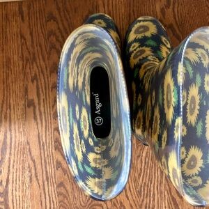 Brighten up rainy days with these stylish sunflower print rain boots. Perfect for adding a pop of color to your outfit.