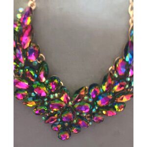 This eye-catching necklace features vibrant rainbow crystals set in a gold-tone chain. Its bold design complements formal and semi-formal attire.