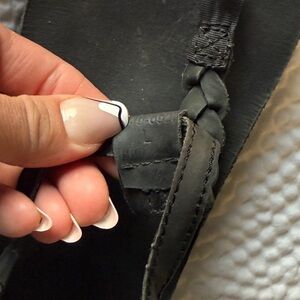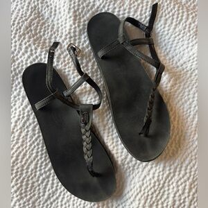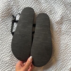 Sleek black sandals with braided strap. Ideal for casual wear.