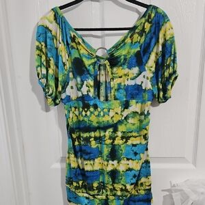 Size is Faded but Bright tie-dye blouse with blue and green patterns. Short sleeves and relaxed fit. Perfect for casual wear. Run a bit small for an XL