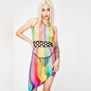 Be instantly summer-ready in this sexy fishnet lingerie dress by Leg Avenue, featuring rainbow stripes with a flirty cut-out midriff, halter neck with sexy bare back, and midi bodycon dress length that’s flattering on all body types. As cute outfits go, this one is pretty perfect for any of your summer looks. Whether your taking it poolside as a swimsuit coverup, pairing it with pasties for a rave outfit, or adding a bikini for a daring date night outfit, this sexy fishnet look will have you looking hot all summer long.